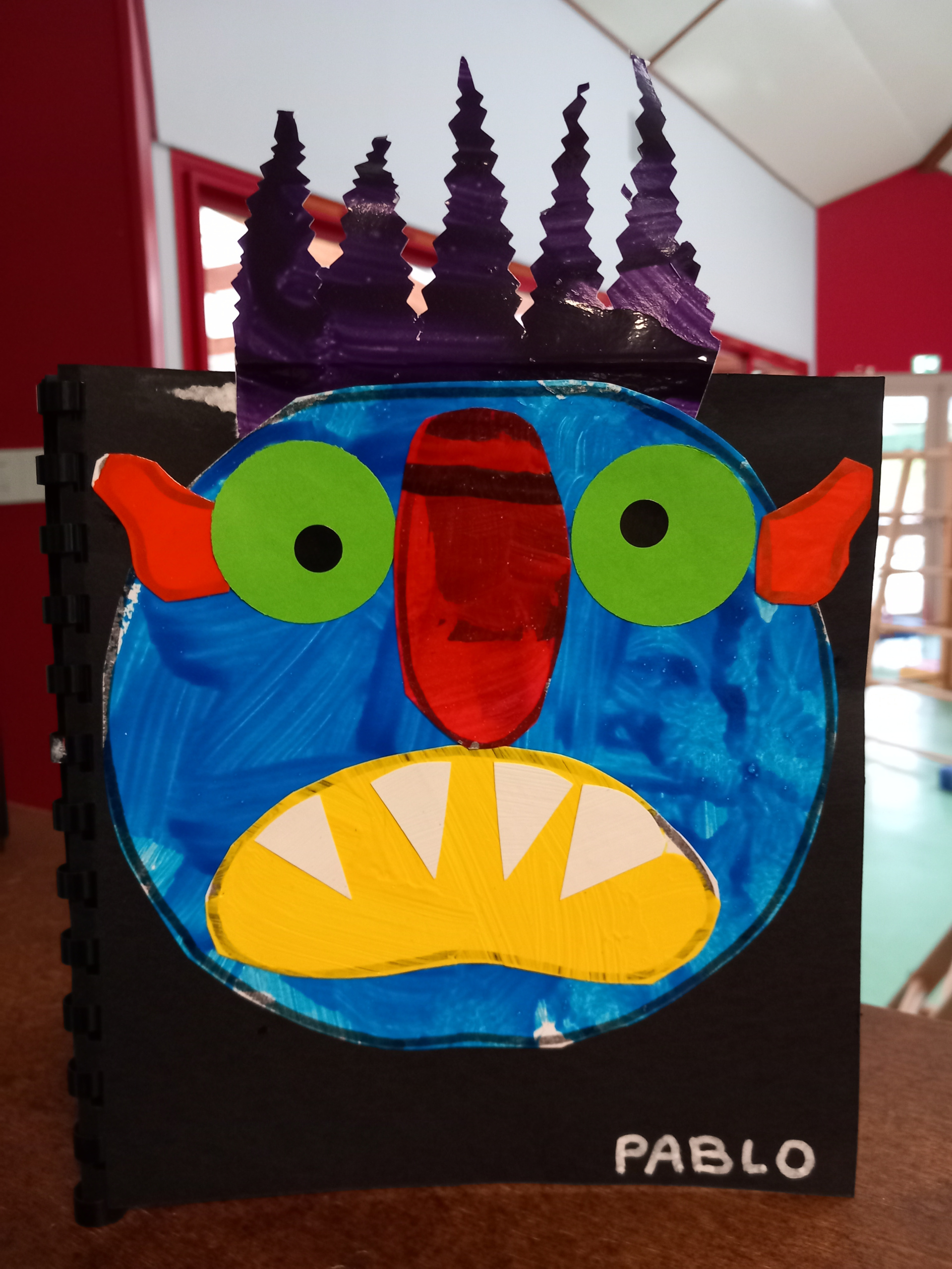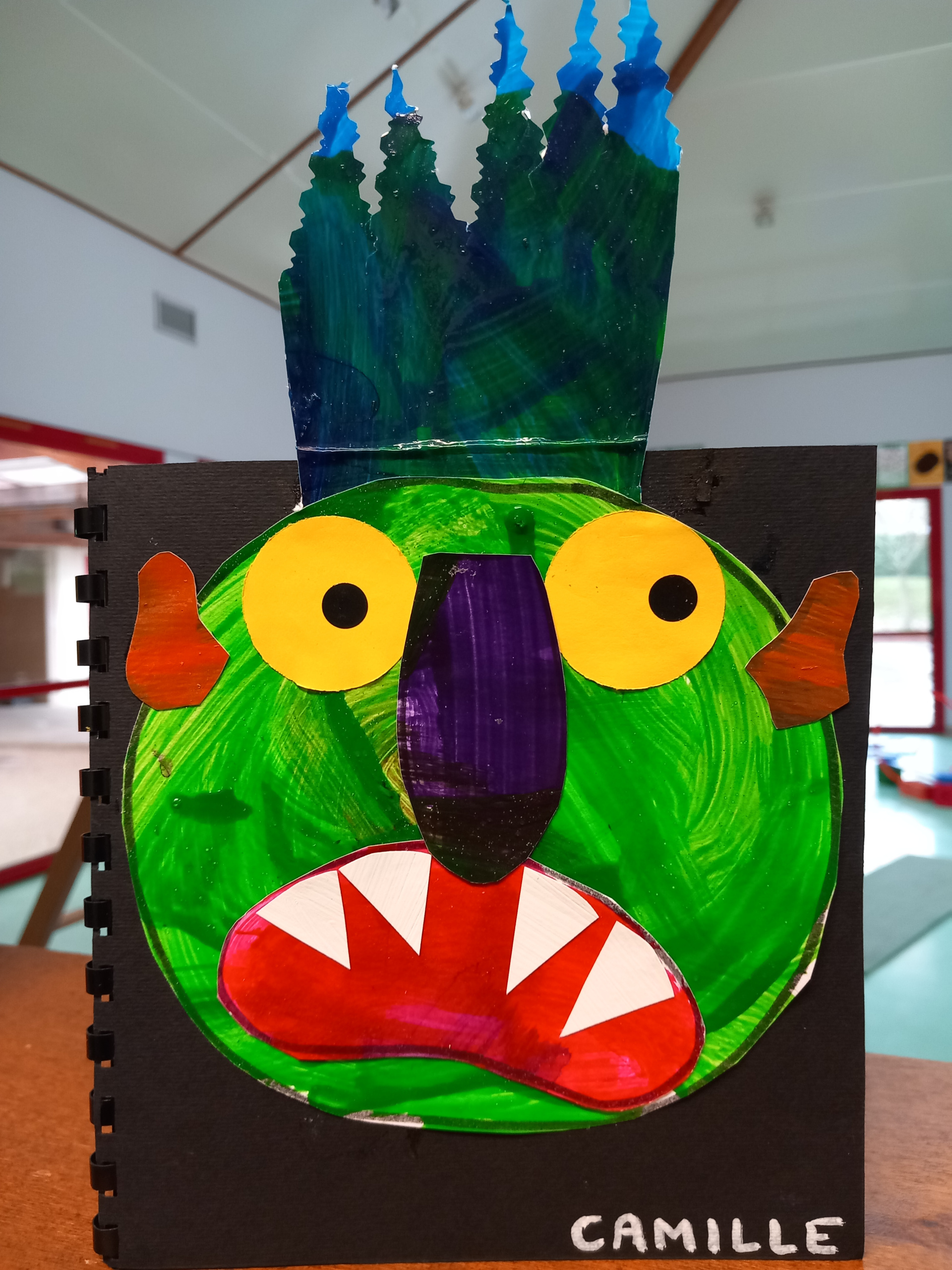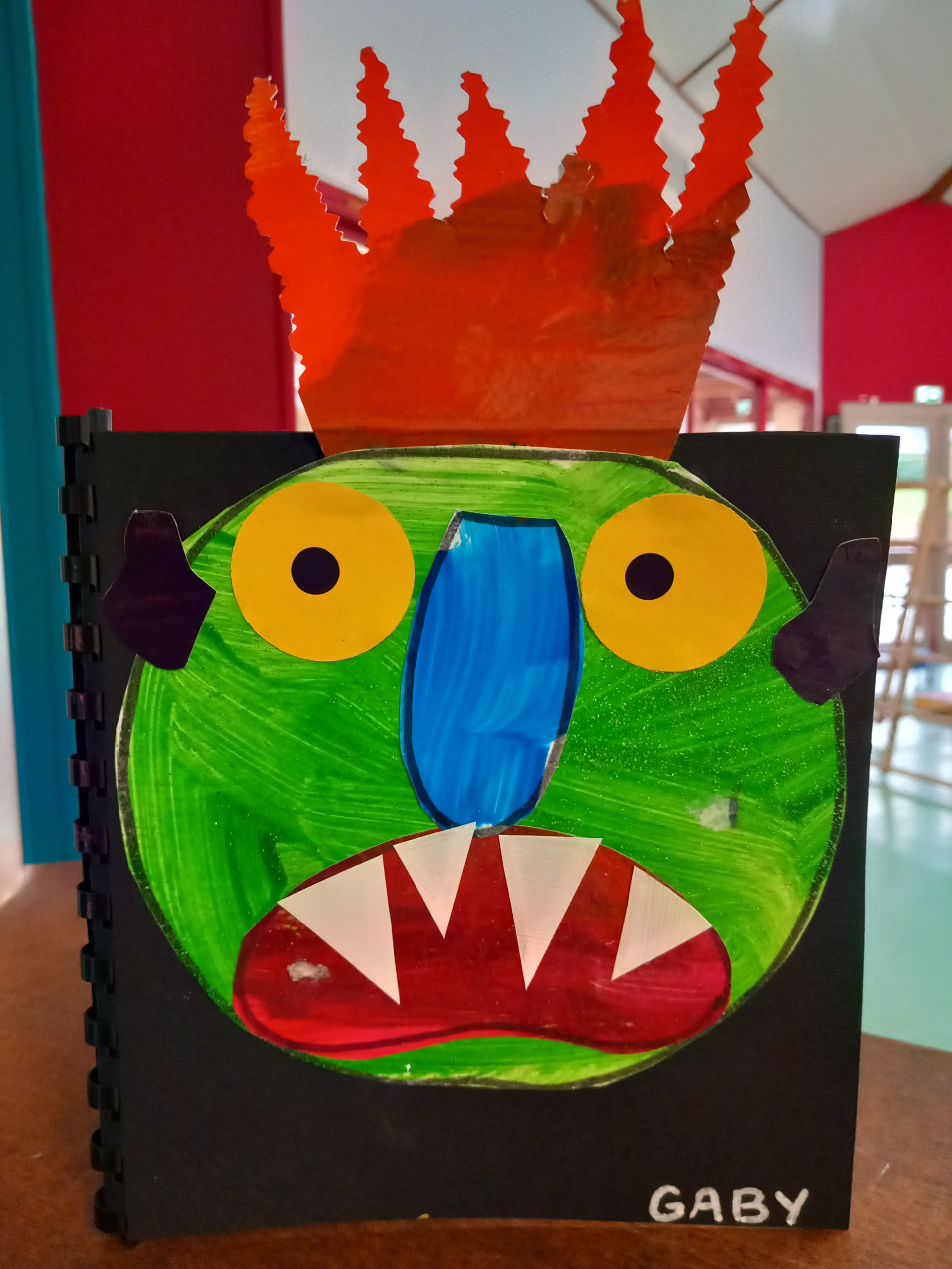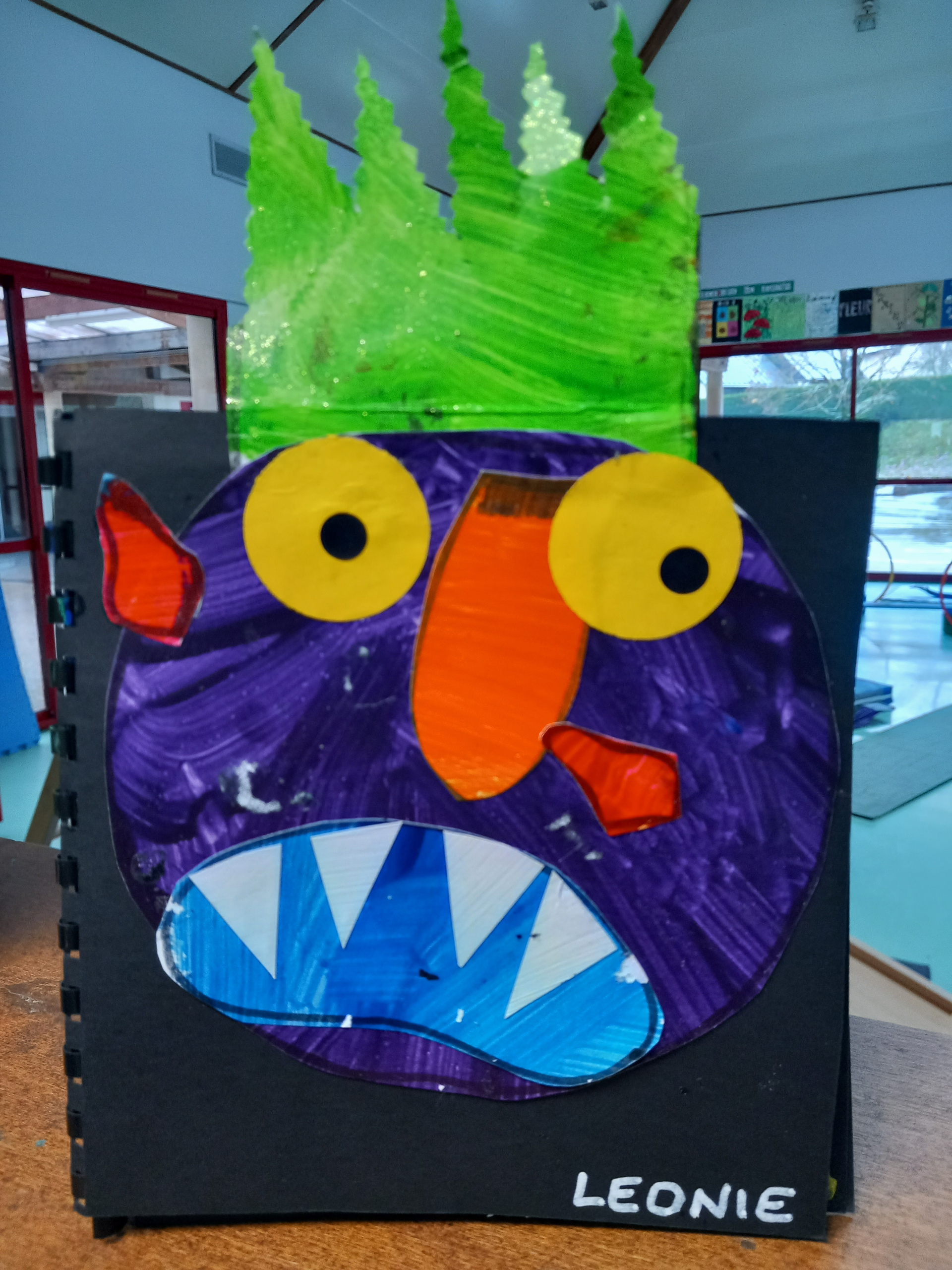 Les PS ont créé leur monstre coloré à la manière de « Va-t’en grand monstre vert ». Ils sont différents mais tous aussi terrifiants ! Heureusement, si on tourne les pages à l’envers on peut enlever la grosse tête et les cheveux ébouriffés, les petites oreilles tordues, la grande bouche avec des dents blanches et pointues, le long nez brillant et les deux grands yeux. Et ils ne font plus peur du tout !