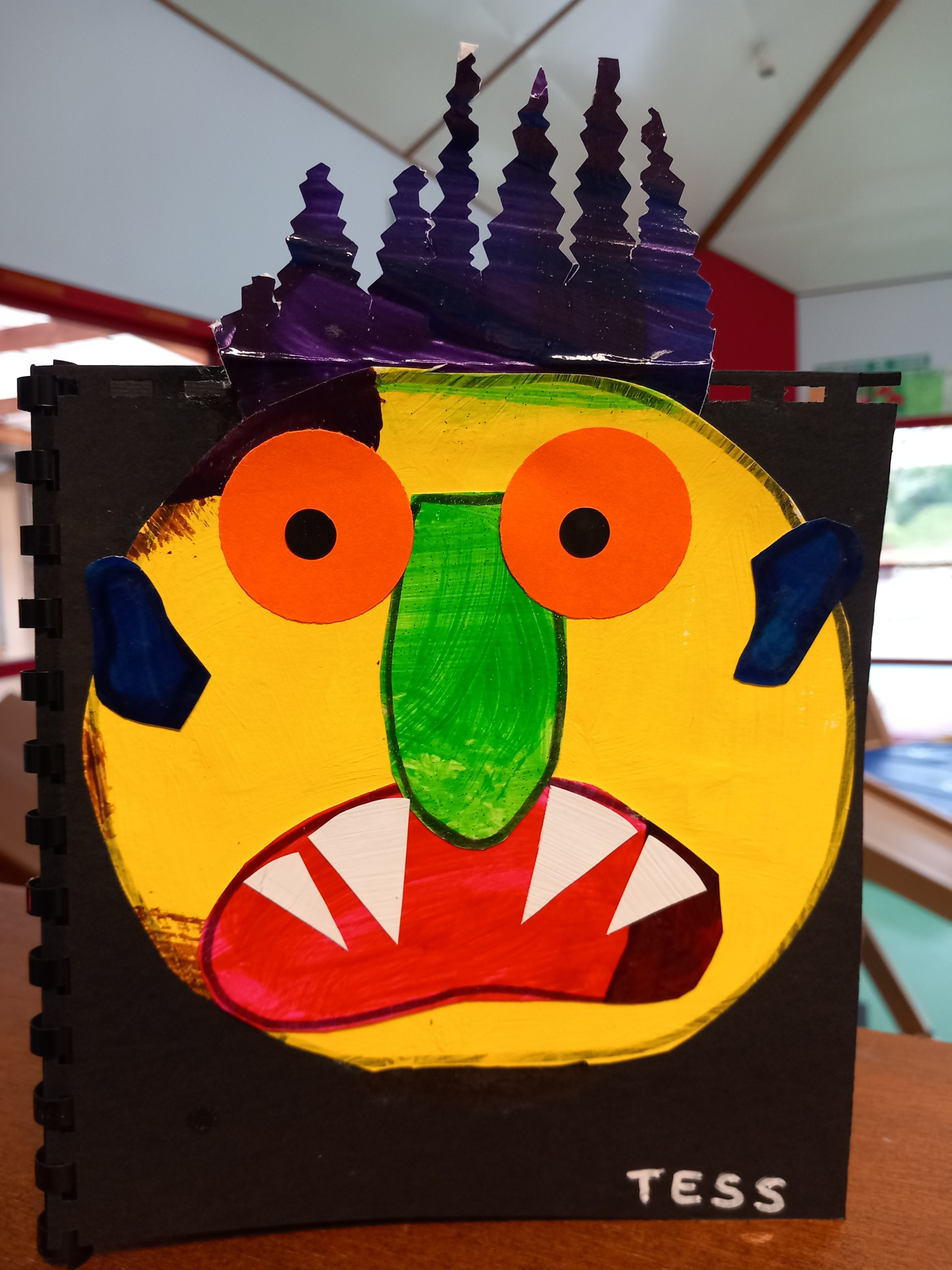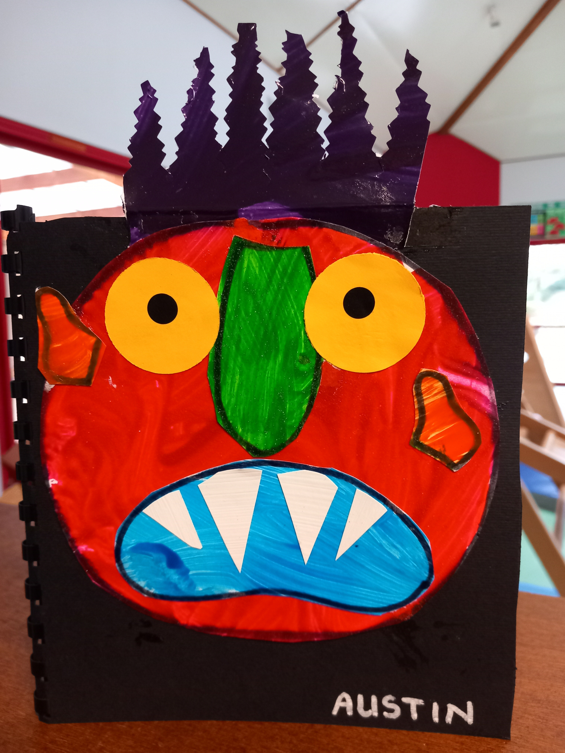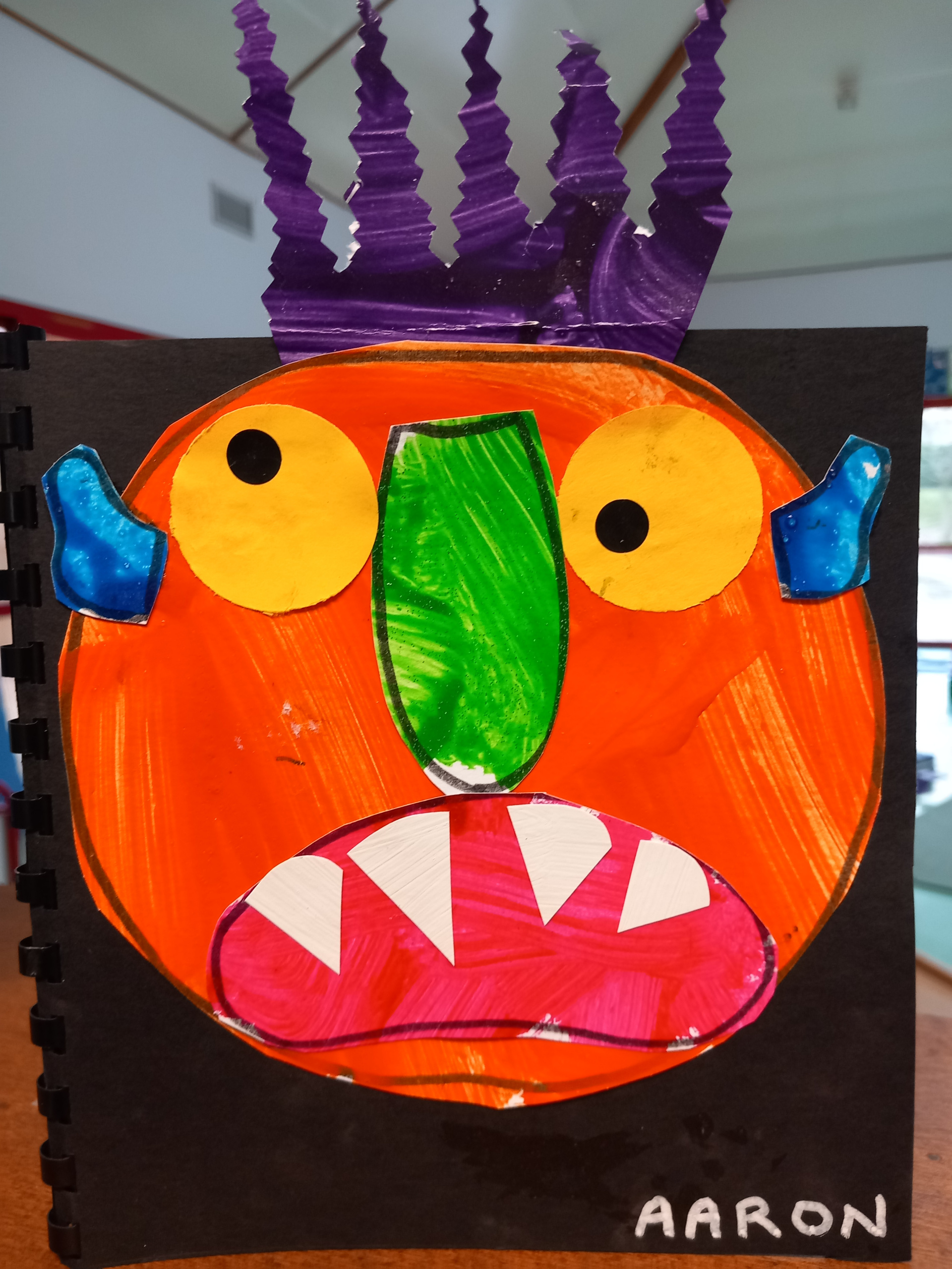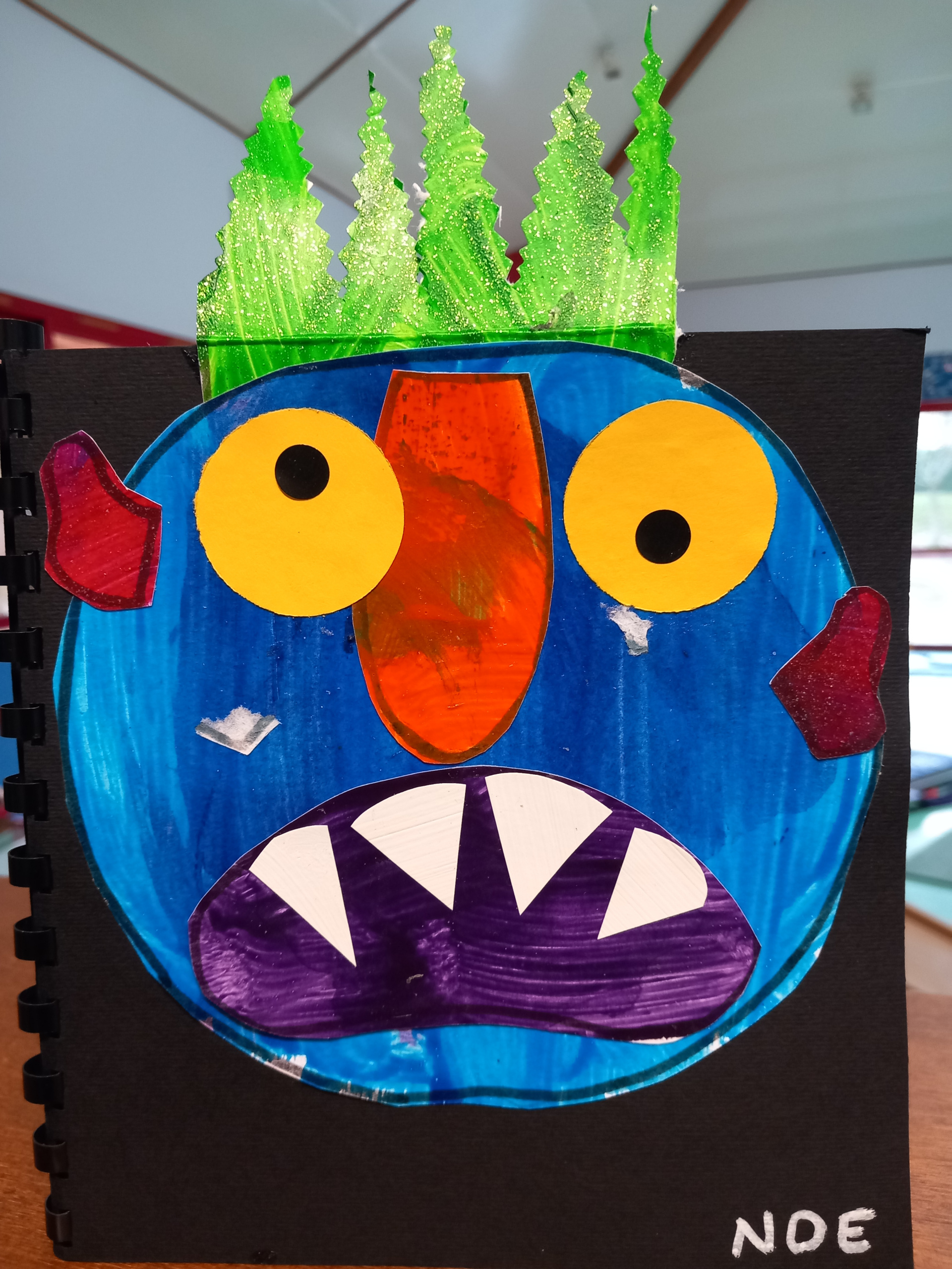 Les PS ont créé leur monstre coloré à la manière de « Va-t’en grand monstre vert ». Ils sont différents mais tous aussi terrifiants ! Heureusement, si on tourne les pages à l’envers on peut enlever la grosse tête et les cheveux ébouriffés, les petites oreilles tordues, la grande bouche avec des dents blanches et pointues, le long nez brillant et les deux grands yeux. Et ils ne font plus peur du tout !