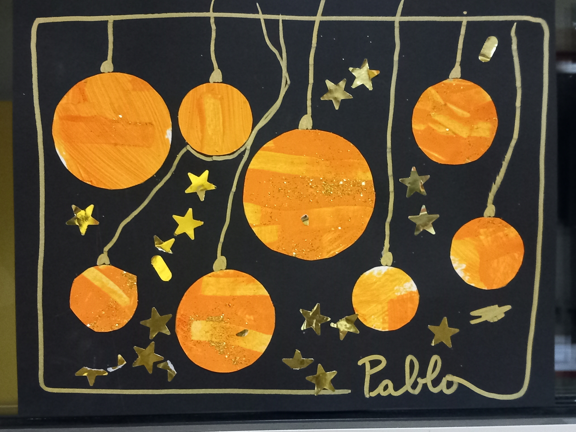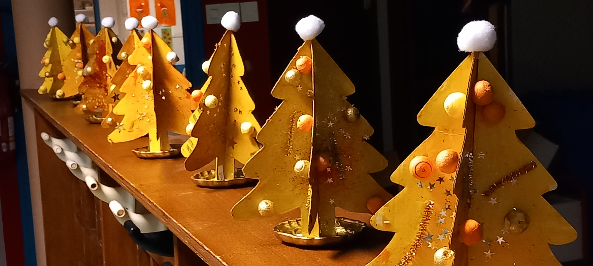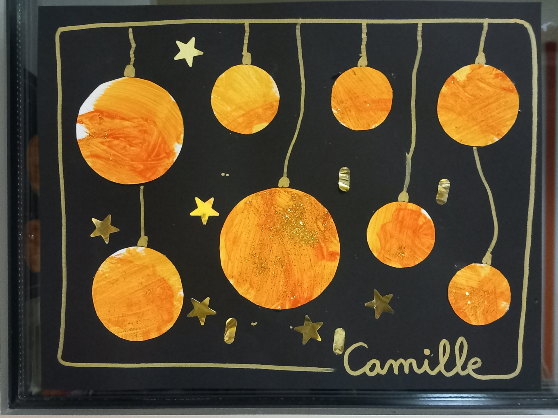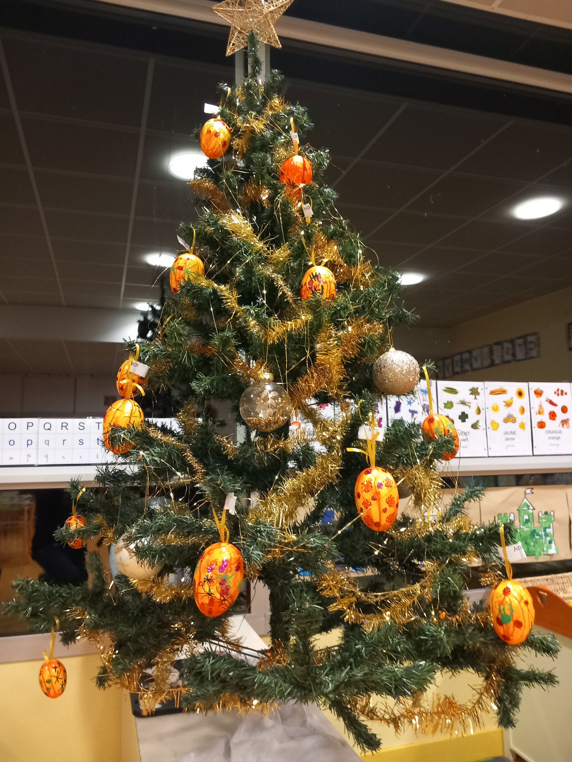 Cette année la couleur retenue pour le Noël des classes maternelles était le jaune/orange. Quelques productions des élèves pour ce Noël ensoleillé et pailleté !
