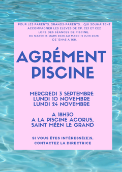 Les élèves de CP, CE1 et CE2 iront à la piscine du 16/03 au 05/06, le mardi après-midi. Nous avons besoin d’accompagnateurs agréés.