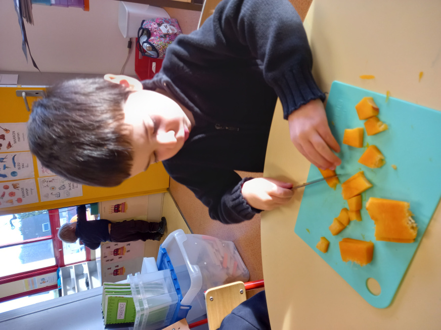 Coiffés des magnifiques chapeaux confectionnés par nos soins, nous avons défilé dans l’école. Nous avons cuisiné une délicieuse soupe avec les courges du potager de l’école. Tout le monde en a repris deux fois !