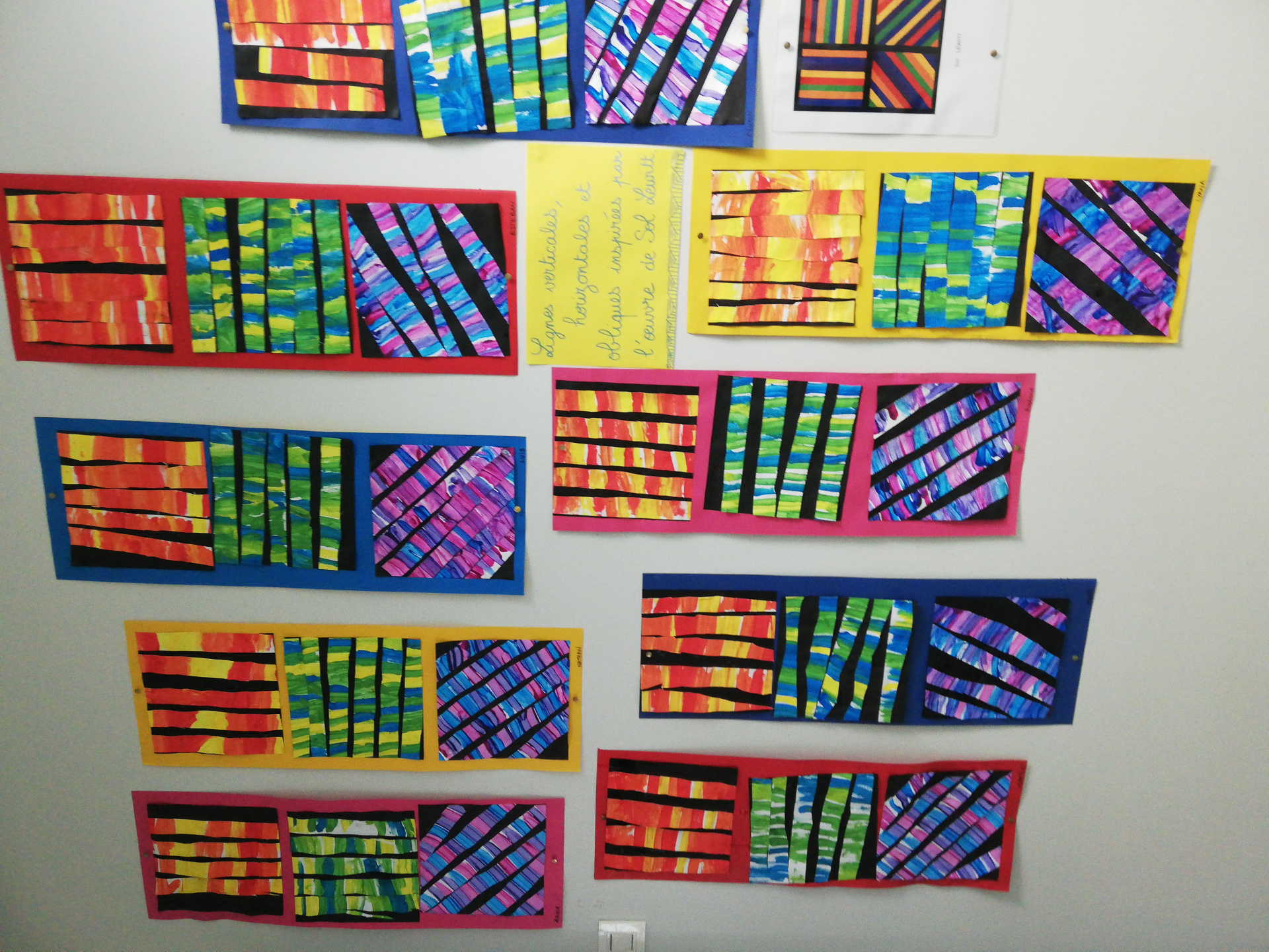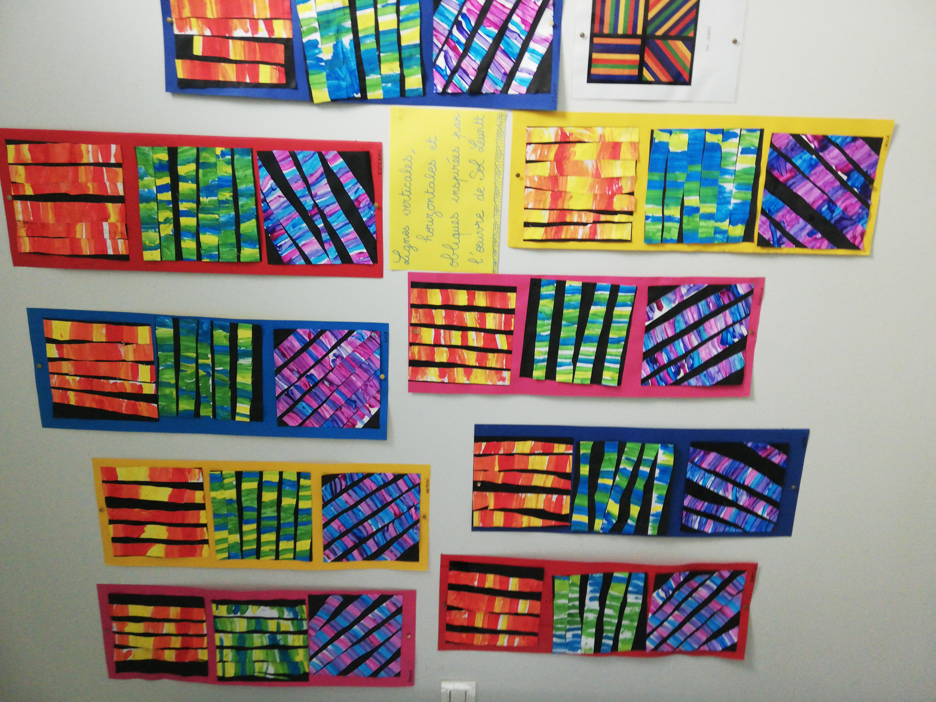 Nous nous sommes inspirés d’une œuvre de l’artiste Sol Lewitt pour réaliser un assemblage combinant des lignes verticales, horizontales et obliques. Ce fut également l’occasion de réinvestir nos connaissances sr les mélanges de couleurs.