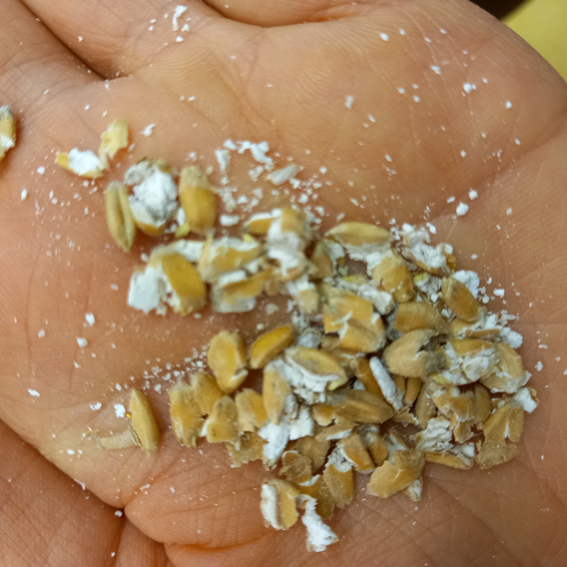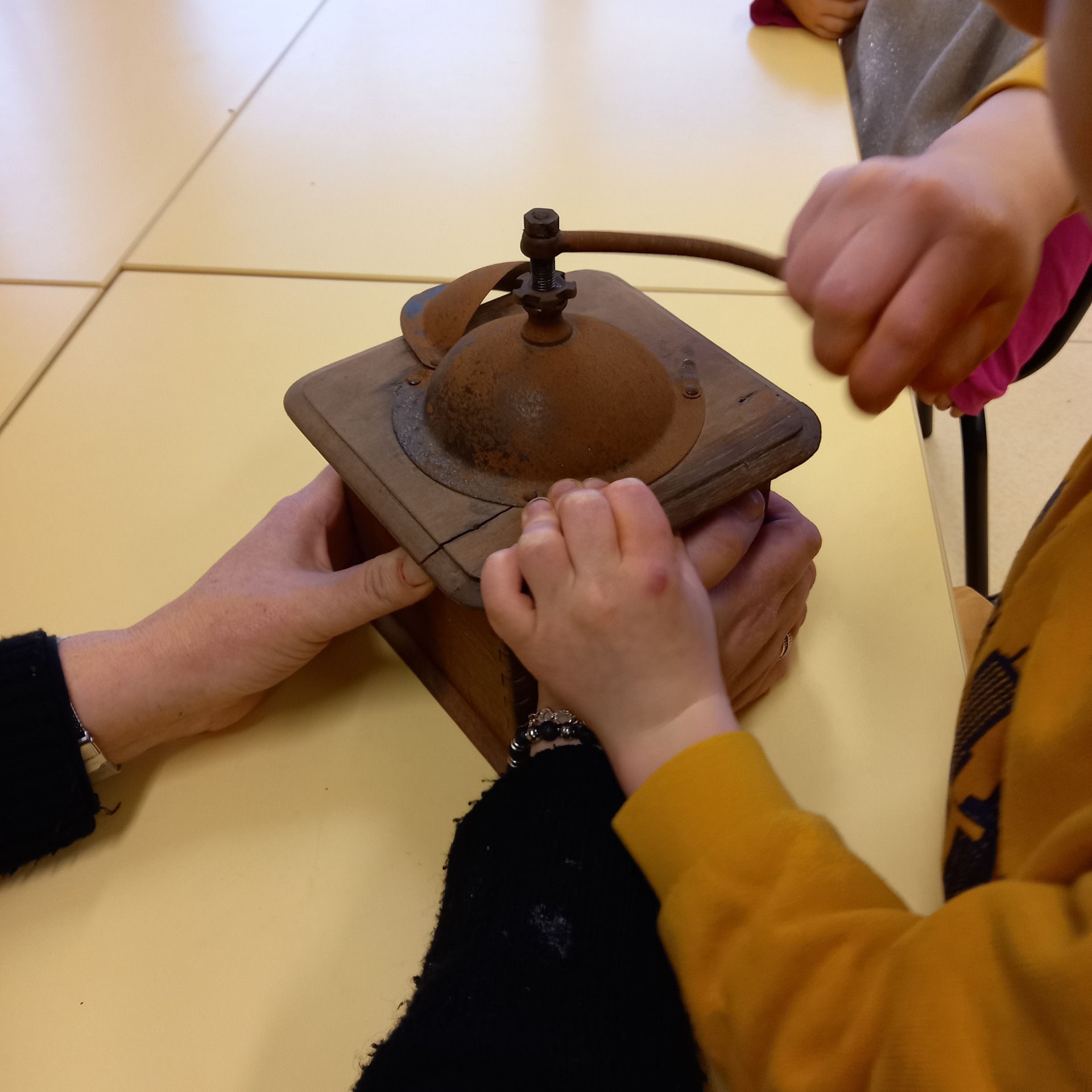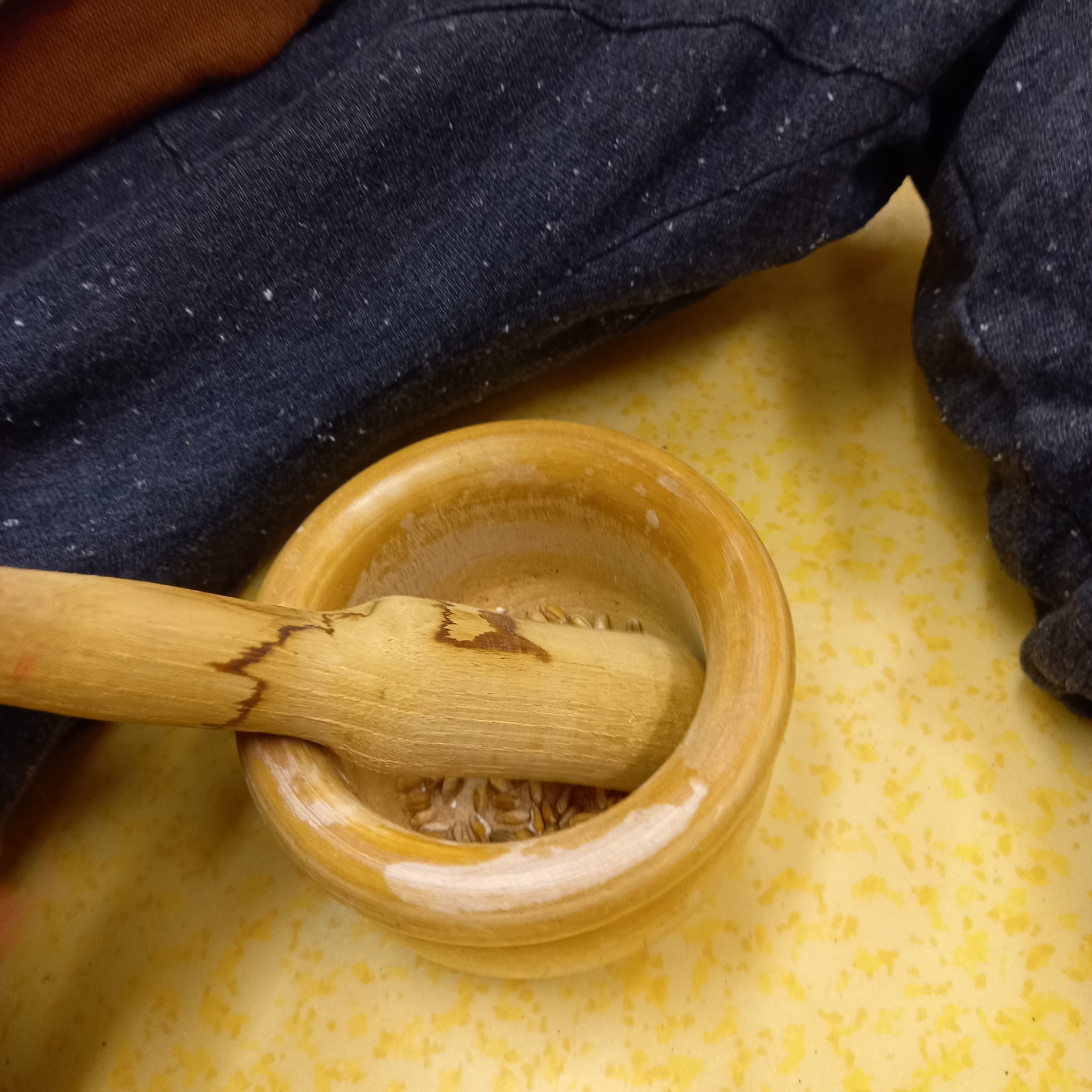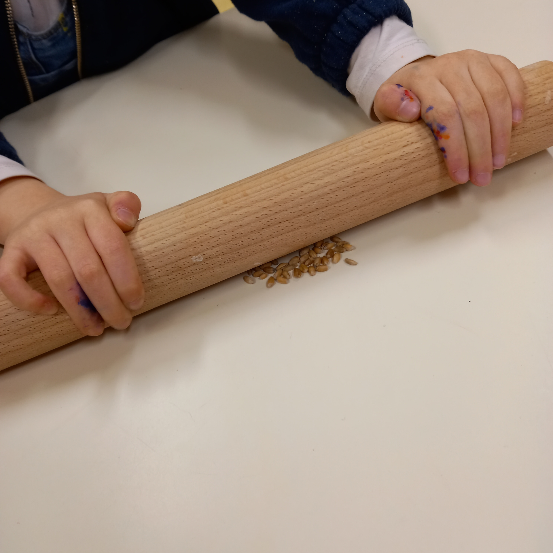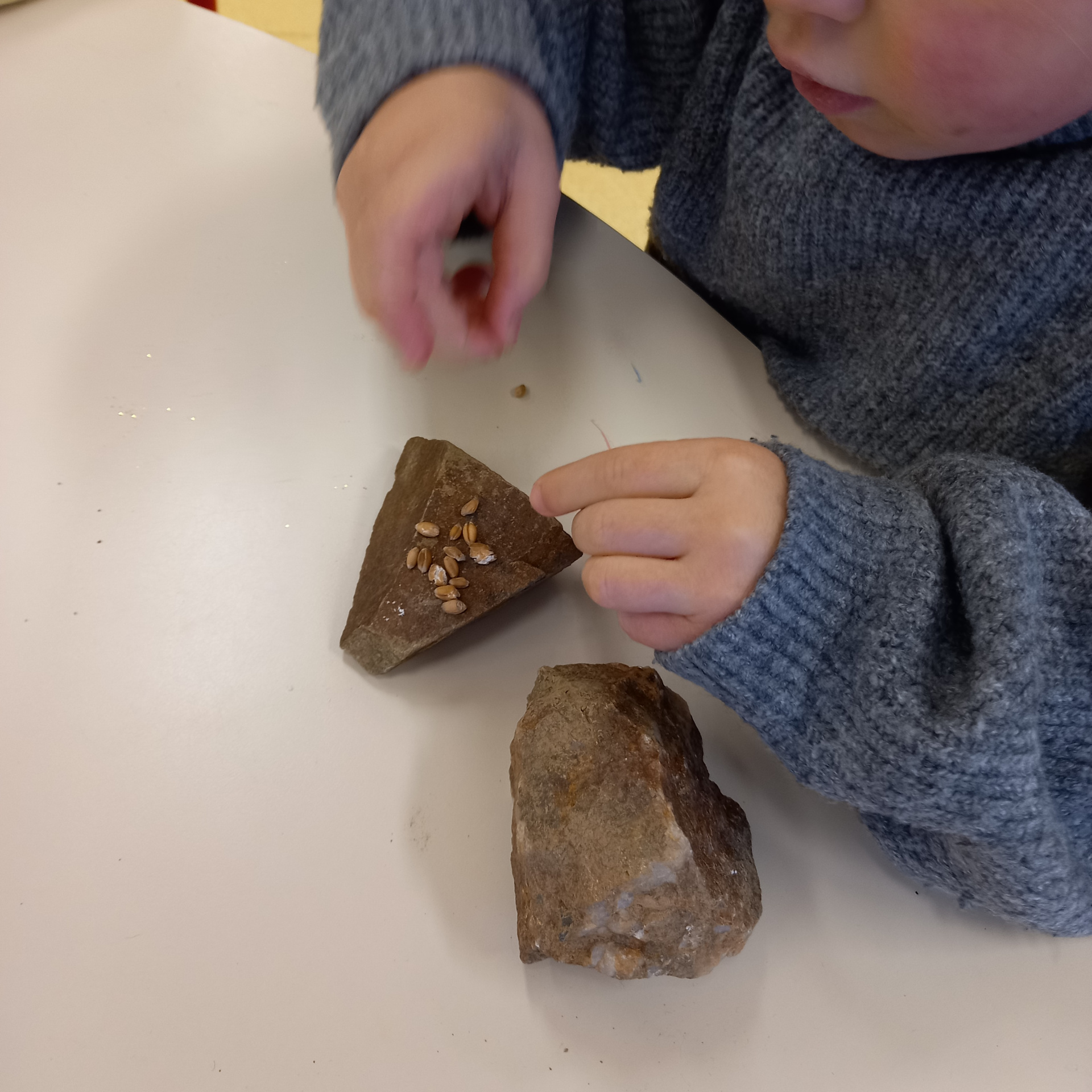 Ensuite, nous avons cherché comment faire de la farine avec les grains de blé que la maitresse a apportés. Nous avons proposé des outils qui pourraient écraser les grains de blé et nous les avons essayés. Ça marche mais c’est difficile…